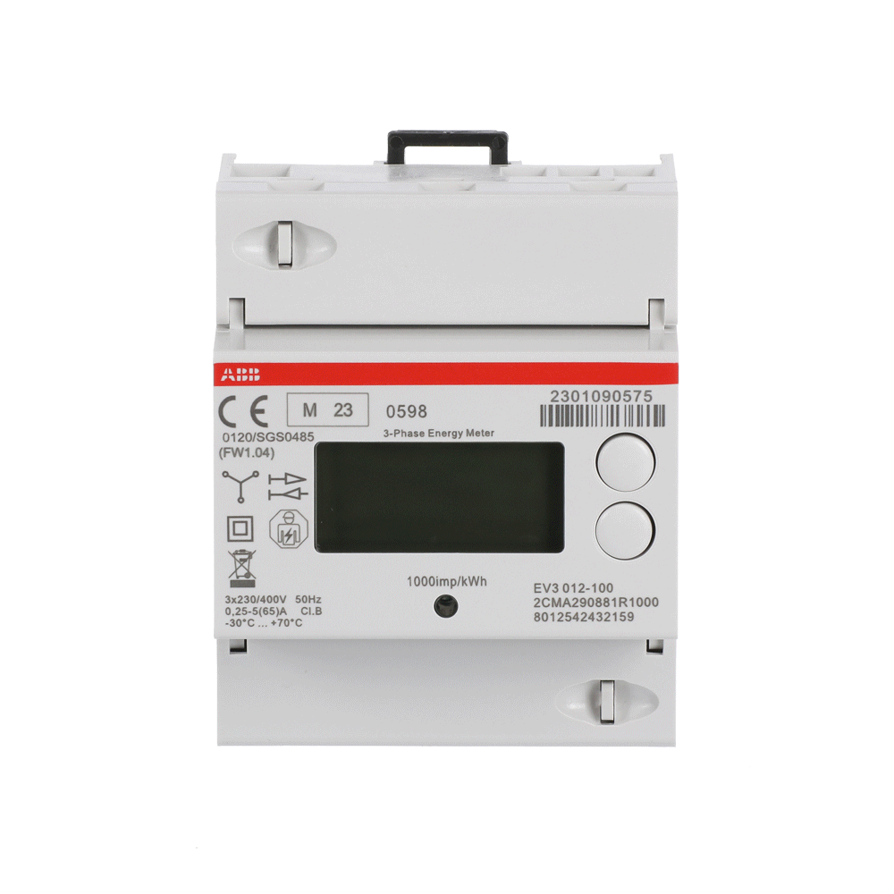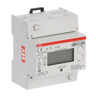 Compteur d’énergie ABB EV3 012-100 triphasé à raccordement direct (65A). Certifié MID avec communication Modbus RTU pour la gestion d’énergie. Disponible au Maroc sur matelec.ma