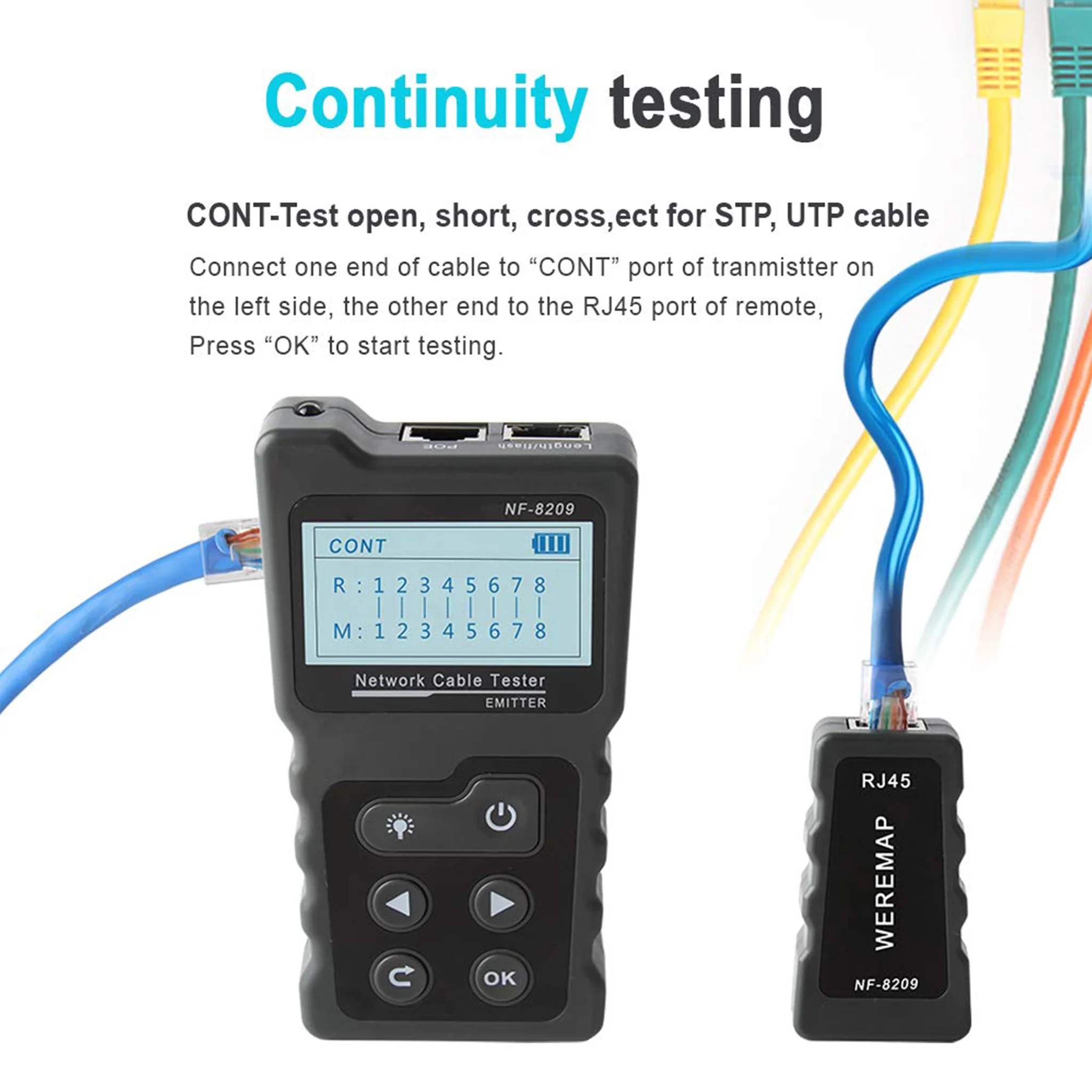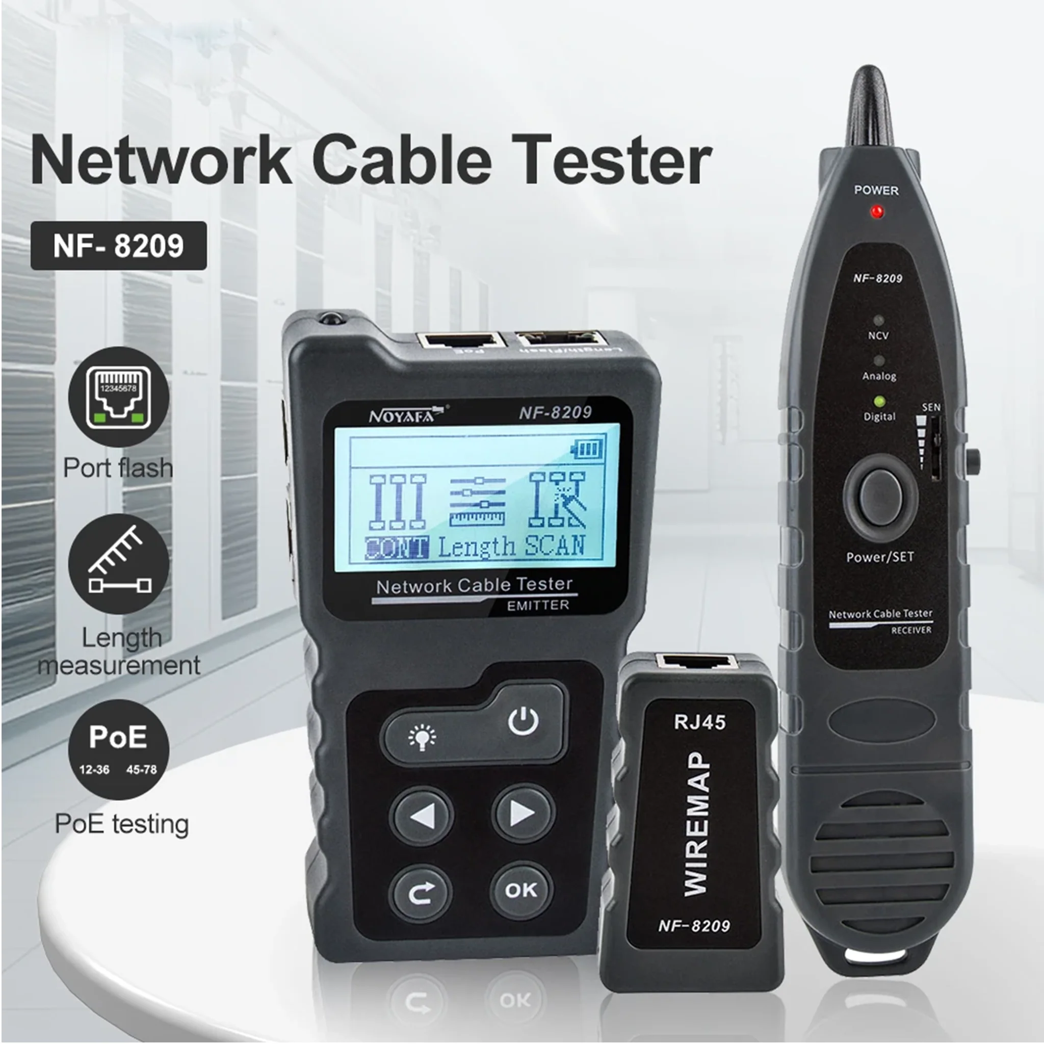Fonctions principales : Continuité (Wiremap), Mesure de longueur (jusqu’à 200m), Traçage (Analogique/Numérique/PoE), Port Flash.